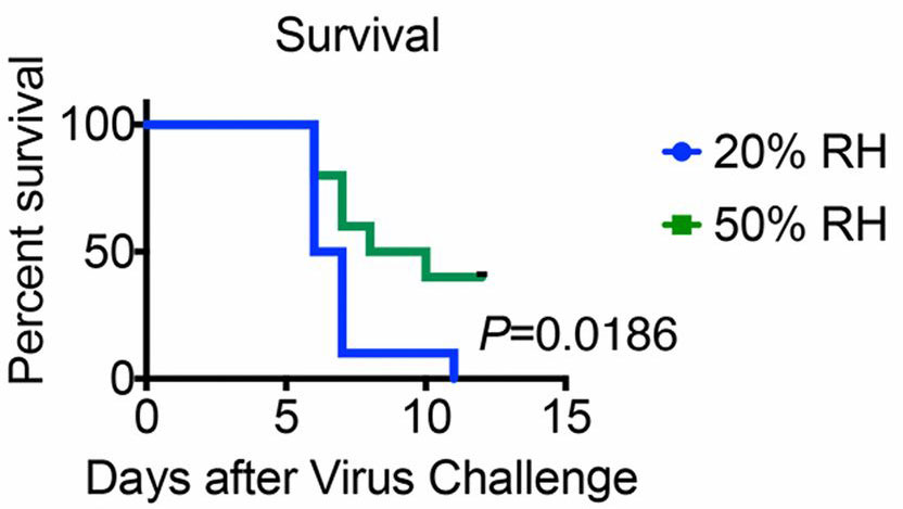 The study found that mice housed at 20%RH suffered a worse disease course compared to those kept at 50%RH, with more rapid and greater weight loss, drop in body temperature and shortened survival. In fact, whereas all mice at the lower humidity died within 11 days of infection, of those that experienced 50%RH, just under half survived until the end of the experiment.